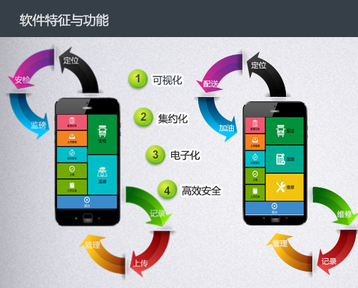 【功能配置】“车辆调度”是基于现代无线互联网技术,充分利用智能化手机的GPS 卫星定位 、GIS高精度地图、NFC技术应用等优势硬件,实现车辆调度的可视化,集 约化,电子化。软件提供准确的位置服务。